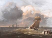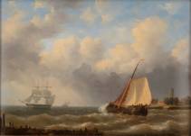 Ary Pleysier (1819-1879), zeilschepen en stoomboot op zee, olieverf op paneel, gesigneerd -restauraties-, 32,5 x 43,5 cm