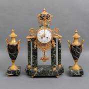 Driedelig klokkenstel, bestaande uit kolomklok en twee cassolettes in groen marmer en met verguld bronzen ornamenten, adres: Martinot, Louis XVI-stijl, Frankrijk, 19e eeuw, 52 x 30 x 13 cm