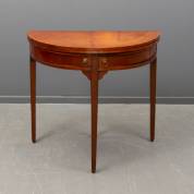 Uitklapbare mahonie halvemaantafel met twee scharnierende laden, 19e eeuw -gebruikssporen-, 70 x Ø 82 cm