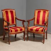 Paar mahonie fauteuils met rood-goudgestreepte bekleding, Frankrijk, Louis Philippe, 92 x 60 x 64 cm