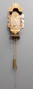 Polychroom beschilderde Friese stoelklok met verguld loden fretten, 18e eeuw -sommige fretten verbogen-, 125 x 32 x 24 cm