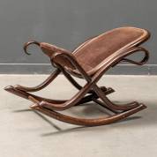 Gebogen gebeitst beuken voetenbankje, uitvoering Thonet, circa 1900, gemerkt -enkele scheurtjes in hout, rietbespanning vervangen door bruine ribfluwelen stoffering-, 42 x 74 x 40 cm