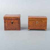Twee diverse houten theedozen, circa 1800 -één met gelijmde deksel en restauraties aan het fineer, de ander met gebruikssporen-, 13 x 11 x 12 en 15 x 11 x 8 cm