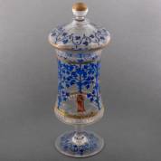 Glazen dekselbokaal met emaille beschildering van figuren omgeven door bladeren, eind 19e eeuw, 23 x Ø 9 cm