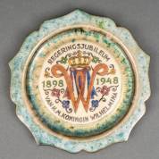 Geëmailleerd koperen herinneringsbordje van het regeringsjubileum van Koningin Wilhelmina 1898-1948, gemerkt 'Handwerk', Ø 15,5 cm