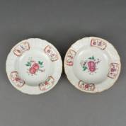 Paar Chinees porseleinen schaaltjes anhua en Lowestoft bloemdecor, de gecontourneerde rand met gouden bies, Qianlong -randschilfers-, Ø 16,5 cm