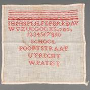 Merklap met tekst: 'School Poortstraat Utrecht W. Patist', 26,5 x 27 cm