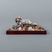 Boheems rood glazen presse-papier met verguld chinoiseriedecor, waarop een zilveren liggende hond -hond met deukjes en gelijmd op basement-, 6 x 12 x 9 cm