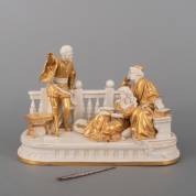 Wit porseleinen tafelstuk met gouden accenten: gesprek op de veranda, uitvoering Capodimonte, Napels -één hand defect-, en 1e gehalte zilveren kroontjespenhouder, 26 x 36 x 16 cm