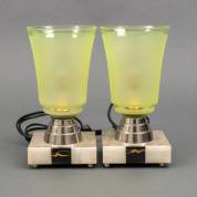 Paar tafellampjes met deels gesatineerde groen glazen kappen op natuurstenen basement, art deco, 22,5 cm