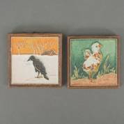 Twee aardewerk cloisonné wandtegels: kuiken, en kraai in de sneeuw, ontwerp L.E.F. Bodart, uitvoering de Porceleyne Fles, Delft, circa 1925, 11 x 11 en 11,5 x 11,5 cm