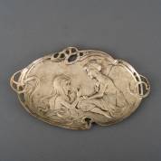 Ovaal zilvertinnen blaadje met decor van twee vrouwen, art nouveau-stijl, 26 x 16 x 2 cm