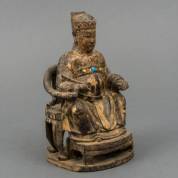 Chinees houten beeld: zittende ambtenaar, met restanten van verguldsel en polychromie, Ming-stijl -defecten-, 21 cm