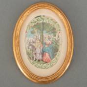 Ingekleurde gravure op perkament: 'Terugkeer uit Egypte', verso met onduidelijk opschrift, en gedateerd 1670, 7,5 x 5 cm