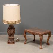Houten tafel met rijk floraal decor voorzien van glazen beschermplaat, en bijbehorende tafellamp met stoffen kap, beide Indonesië, 20e eeuw, tafel 36 x 54 x 42 cm, lamp 95 x Ø 39 cm