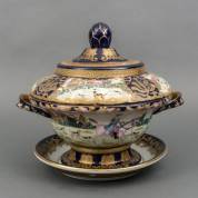 Chinees porseleinen terrine met polychroom jachtdecor, staand op onderschotel, onderschotel Qianlong gemerkt, 20e eeuw -één handvat gelijmd-, 33 x Ø 33 cm