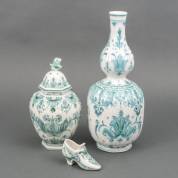 'Delvert' Delfts groene aardewerk vaas, bedekte vaas en schoentje met floraal decor, uitvoering de Porceleyne Fles, Delft, 38 cm