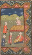Perzische miniatuurschildering: figuren rustend onder een opgespannen doek, gouache op papier, Mogol-stijl, 20 x 12 cm