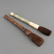 Twee oosterse penselen met paardenhaar, waarvan één met houten handvat en reliëfdecor van figuren en draak, en één met serpentijnen en benen handvat, 44 cm