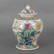 Chinees porseleinen dekselvaas met polychroom bloem-, vogel- en vlinderdecor, 19e eeuw -chip van deksel, hals gelijmd-, 34 x Ø 24 cm