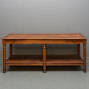 Grote eiken werktafel met schap en twee lades op gecanneleerde poten, begin 20e eeuw -gebruikssporen-, 81 x 200 x 69 cm