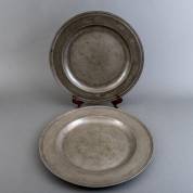 Grote tinnen schotel met diverse merken, waaronder RB, 18e eeuw, en grote tinnen schotel met gegraveerd stadsgezicht, Ø49 cm