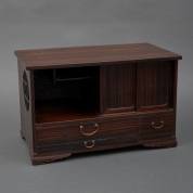Klein Japans coromandelgefineerd kastje met twee schuifdeurtjes, open compartiment en drie laatjes -lichte gebruikssporen-, 30 x 48 x 27 cm