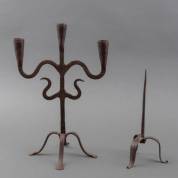 Smeedijzeren drielichts kandelaar en smeedijzeren penkandelaar, 16e/17e eeuw, 37 x 25 x 20 cm