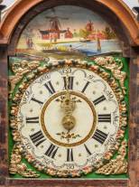 Friese staartklok in eiken kast, de wijzerplaat met geschilderd decor: visser in landschap, aan achterzijde van de wijzerplaat gesigneerd voor Lobbe de Vries, Joure, tweede helft 19e eeuw, herkomst: 'De Klokkenmaker' Piet van Apeldoorn, Harderwijk, 2014, inclusief kopie factuur, 130 x 40 x 20 cm