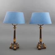 Paar deels vergulde en deels gepatineerde bronzen tafellampen met bolklauwpoten -inclusief paar blauwe kappen; montagebuisje daarvoor momenteel iets te kort, moeren ontbreken-