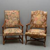 Twee houten armstoelen, één in beuken en één in noten, beide met machinale gobelin bekleed, 104 x 62 x 55 cm