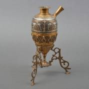 Messing waterpijp met kokosnoot als reservoir, ingelegd met wit metaal, staande op drie poten, Midden-Oosten, 19e/20e eeuw, 33 x 23 x 14 cm