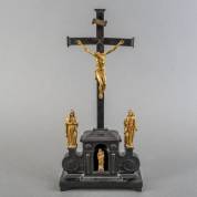 Ebbenhouten crucifix, met verguld bronzen beeldfiguren: Christus aan het kruis, op het basement geflankeerd door Heilige Maagd Maria en Heilige Johannes, en in de nis van het basement een heilige met een kruis in zijn rechterhand, vemoedelijk Duitsland, 17e eeuw, 45 x 21 x 9 cm