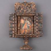 Religieus schilderij: de aartsengel Gabriël, in gesneden houten omlijsting op voet, school van Cusco, Peru, 17e-19e eeuw -lijmresten bij afdakje-, 35,5 x 24,5 x 8,5 cm