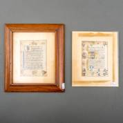 Twee geïllumineerde manuscriptbladen uit een middeleeuws getijdenboek, dubbelzijdig, met initialen en ornamentranden in kleur en goudgehoogd, 12 x 9 cm