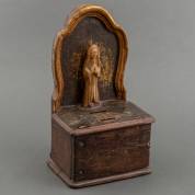 Eiken offerblok met wassen Maria, met resten van polychrome beschildering, 18e eeuw -oude houtwormgaatjes en restauraties-, 34 x 19 x 20 cm