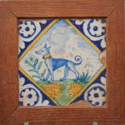 Polychroom aardewerk kwadraattegel: hond met gele halsband, circa 1625 -beschadigingen aan randen-, 18,5 x 18,5 x 1,5 cm