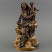 Bronzen beeld: Maria met kind, de slang vertrappend met haar voet, niet gesigneerd, 19e/begin 20e eeuw -armpje van Jezus gescheurd-, 37 x Ø 22 cm