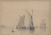 Johannes Christiaan Schotel (1787-1838), schepen op zee, potloodtekening, l.o. gesigneerd -lichte waterschade aan rechterrand-, 16 x 23 cm