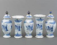 Vijfdelig Delfts aardewerk kaststel met blauw-wit chinoiseriedecor: zotjes en lange lijzen, gemerkt met *AK voor Albertus Kiell, uitvoering De Witte Ster, 1762-1772 -defecten en restauraties, één deksel geheel gelijmd-, 27 x Ø 9 cm