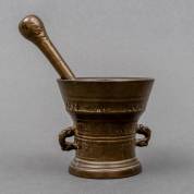 Bronzen vijzel met randtekst 'Lof Godt van Al', en gedateerd 1646 -decoratie sleets-, met stamper -onderzijde met ingekrast monogram-, 11 x Ø 11 cm