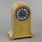 Messing mantelklok met geëmailleerde wijzerplaat in verschillende kleuren, de randen van de kast met klinknageldecoratie, ontwerp en uitvoering onbekend, begin 20e eeuw -gebruikssporen-, 26,5 x 19 x 9,5 cm