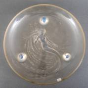 Licht opaliserende glazen schaal: 'Sirène', staande op drie poten, ontwerp en uitvoering René Lalique, ontwerp 1920, gemerkt R. Lalique in reliëf, 6 x Ø37 cm