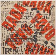 Theo van Doesburg (1883-1931) & Kurt Schwitters (1887-1948), 'Kleine Dada soiree' (programma), lithografie in rood en zwart, Haagsche Kunstkring, 1922/23 -lichte slijtagesporen langs de vouwen, gat-, 30 x 30 cm