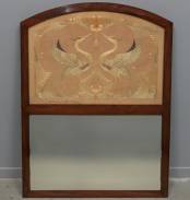 Mahonie spiegel met geborduurd zijde bovenstuk in de vorm van twee reigers, art nouveau -lichte waterschade aan onderzijde borduurwerk-, 116 x 86 x 3 cm