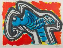 Karel Appel (1921-2006), 'Après-midi d'un signe sur la place de l'école IV', zeefdruk 48/85, in potlood genummerd en r.o. gesigneerd, daarbij: vijf platen met tekst behorend bij de voorstelling, 48/85, voorblad gesigneerd in potlood, uitgave Editions F.B., 1987, 60 x 80 cm