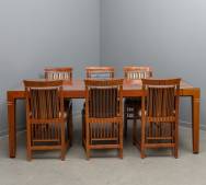 Bubingahouten eetkamertafel met glasplaat, met zes stoelen waarvan twee met zwartlederen en vier met gestreept velours bekleding, het geheel gedecoreerd met ebbenhouten biezen en aluminium ornamenten, serie Decoforma, uitvoering Schuitema -gebruikssporen, één stoel met gaatje in de bekleding en hoekje van de leuning-, 75 x 210 x 100 cm