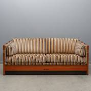 Bubingahouten bank met gestreepte velours bekleding, het geheel met ebbenhouten en aluminium ornamenten, serie Decoforma, uitvoering Schuitema -lichte gebruikssporen-, 75 x 200 x 85 cm