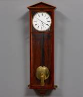 Weense regulateur, 'Dachluhr', met achtdaags uurwerk, de geëmailleerde wijzerplaat met Romeinse cijfers en blauw stalen wijzers, mahonie kast met bandintarsia in esdoorn, circa 1830-40, aangekocht bij: Van Dreven Antiek, Amsterdam, 2000, 85 x 30 x 11 cm