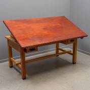 Hardhouten bureau met op verschillende hoogtes te verstellen blad, Nederland, eerste helft 20e eeuw -één plint van blad ontbreekt-, 82 x 162 x 100 cm